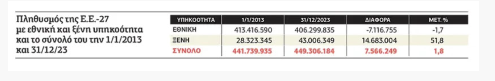 Στην αύξηση του φθίνοντος πληθυσμού της Ευρωπαϊκής Ενωσης ως συνόλου κρίσιμος και αναντικατάστατος είναι ο ρόλος των μεταναστών με πολύ όμως μεγάλες διαφορές ανάμεσα στα κράτη-μέλη της. Στο άρθρο αυτό, αφού δώσουμε σε έναν συνοπτικό Πίνακα τη μεταβολή του πληθυσμού με ξένη και εθνική υπηκοότητα και του συνολικού πληθυσμού της την 31.12.23 σε σχέση με την 1.1.2013, θα αναφέρουμε τις 5 ομάδες του πληθυσμού της ανάλογα με τη μεταβολή (αύξηση ή μείωση) του πληθυσμού με εθνική και ξένη υπηκοότητα των κρατών-μελών της και την επίπτωσή τους στη μεταβολή του συνολικού πληθυσμού τους. Τα στοιχεία που χρησιμοποιούμε είναι από τη βάση δεδομένων της Στατιστικής Υπηρεσίας της Ε.Ε. (της Eurostat).