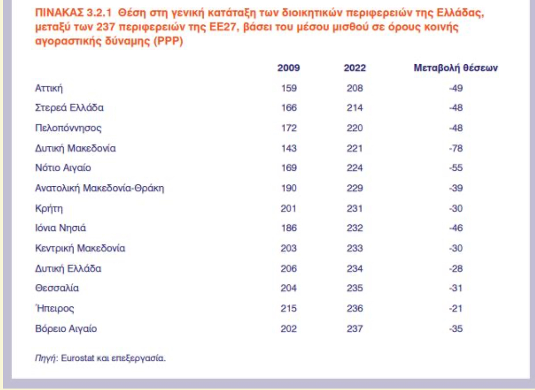 Από το 2009 ως το 2022 οι ελληνικές περιφέρειες έχασαν κατά μέσο όρο σαράντα θέσεις στην ευρωπαϊκή κατάταξη των μισθών. Το Βόρειο Αιγαίο βρίσκεται πλέον στην 237η θέση, δηλαδή στην τελευταία, ενώ η Ήπειρος στην 236η. Σε όλη αυτή την περίοδο οι αποδοχές παραμένουν στάσιμες και η αγοραστική δύναμη των εργαζομένων συνεχώς μειώνεται.