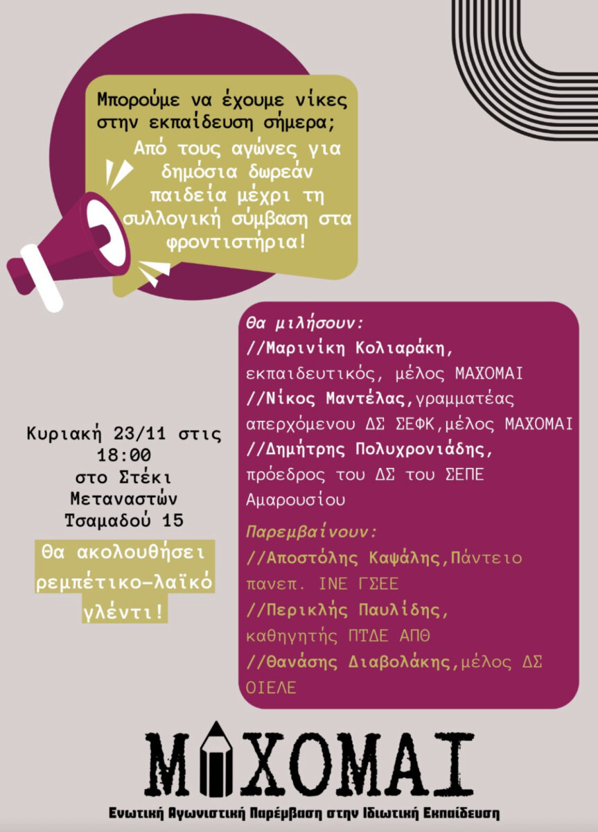 Συναδέλφισσες, συνάδελφοι, σας καλούμε στην εκδήλωση – συζήτηση που διοργανώνουμε, να γνωριστούμε και να συζητήσουμε για όλα αυτά που μας αφορούν, για να νικήσουμε όλοι και όλες μαζί στη μάχη της παιδείας και της εργασίας.