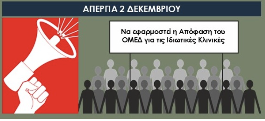 Μετέχουμε στην Απεργία των Ιδιωτικών Κλινικών που κήρυξε η Ομοσπονδία για την Τρίτη 2 Δεκεμβρίου και στη συγκέντρωση του Κλάδου στις 9 π.μ. στο εφετείο (στο κτίριο του Αρείου Πάγου) με αίτημα: