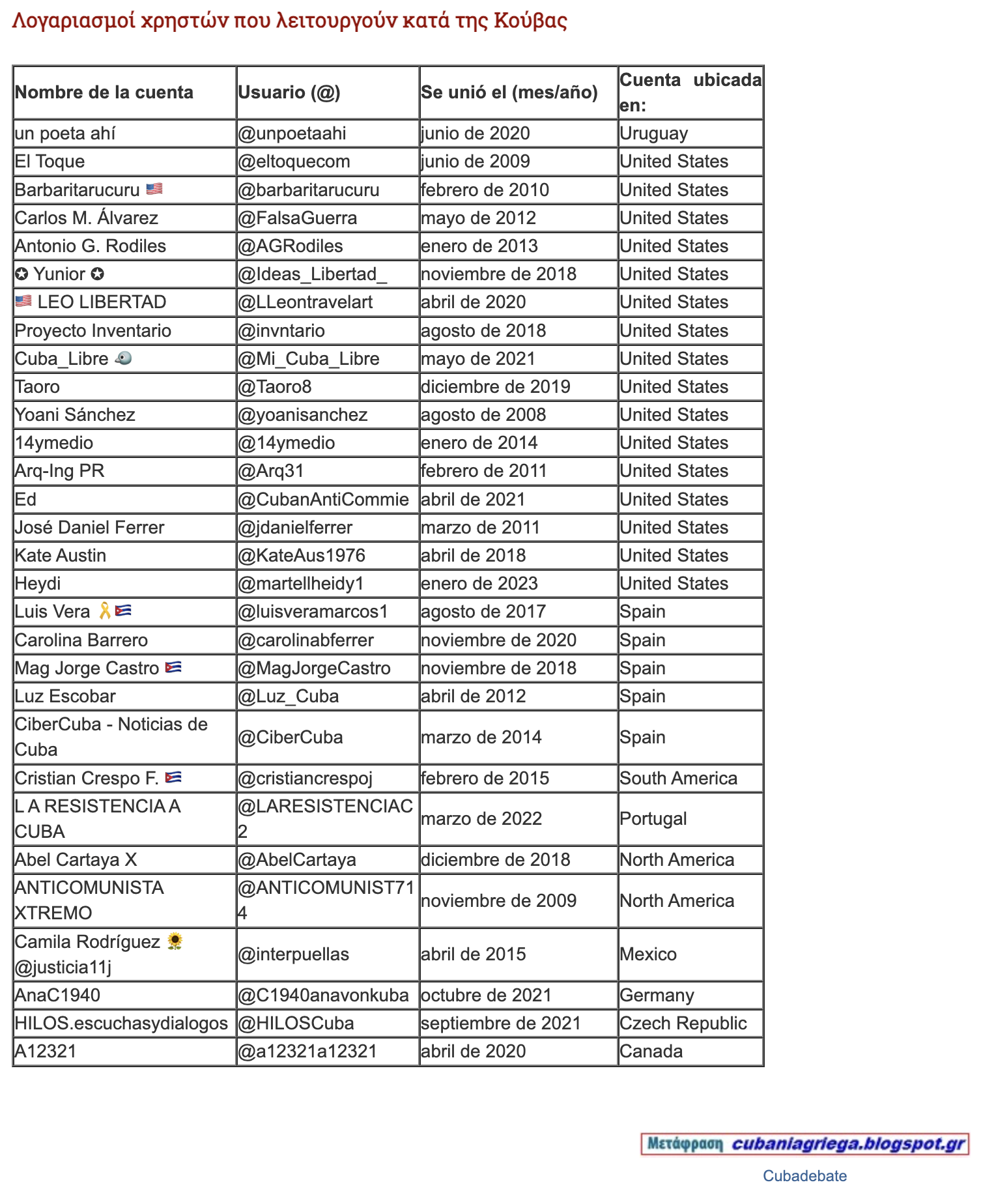 Με βάση τη λειτουργία X «Σχετικά με αυτόν τον λογαριασμό», αναλύθηκε ένα σκοπούμενο δείγμα 30 προφίλ που είναι πολύ ενεργά σε εκστρατείες της ακροδεξιάς κατά της κουβανικής κυβέρνησης και της επαναστατικής διαδικασίας. Πρόκειται για λογαριασμούς που παρουσιάζονται ως φωνές «από την Κούβα» ή ως άμεσο μέρος του εσωτερικού πολιτικού σκηνικού του νησιού, είτε σε ατομικό επίπεδο είτε μέσω μέσων μαζικής ενημέρωσης.
