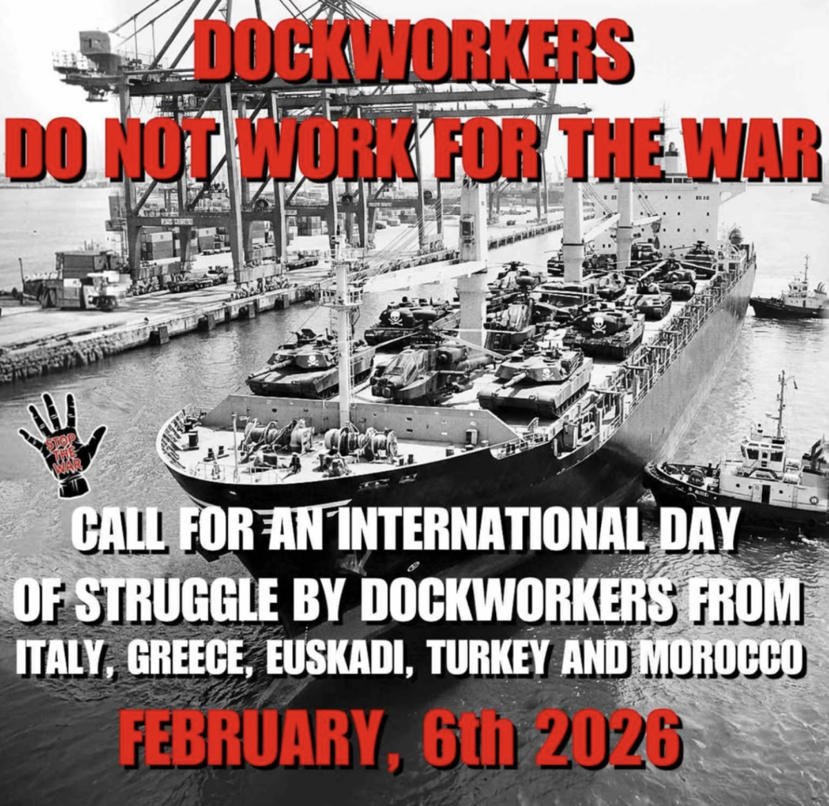 Μοιραζόμενοι την αποφασιστικότητα να απορρίψουμε κάθε συνενοχή των εργαζομένων στα λιμάνια στη μεταφορά όπλων και πολεμικού υλικού και να εκφράσουμε την έντονη αντίθεσή μας στις συνέπειες της πολεμικής οικονομίας, τα συνδικάτα απευθύνουν ένα σαφές κάλεσμα για Διεθνή Ημέρα Δράσης και Αγώνα στις 6 Φεβρουαρίου 2026.