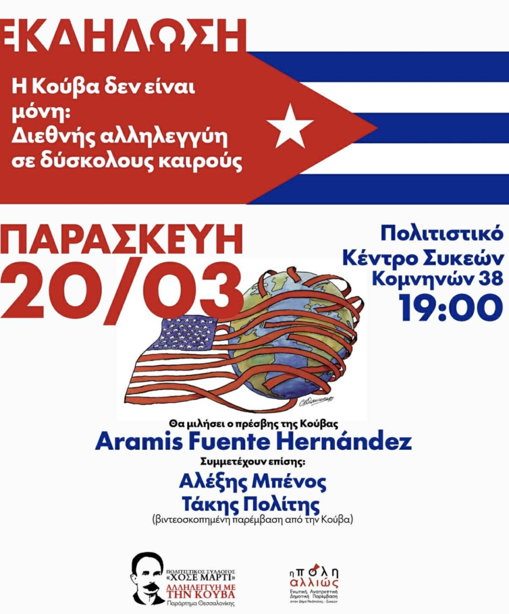 Ο Πολιτιστικός Σύλλογος «Χοσέ Μαρτί – Αλληλεγγύη με την Κούβα» (Παράρτημα Θεσσαλονίκης), σε συνεργασία με την Πόλη Αλλιώς: Ενωτική Ανατρεπτική Παρέμβαση στον Δήμο Νεάπολης Συκεών, διοργανώνει εκδήλωση αλληλεγγύης προς την Κούβα με τίτλο: «Η Κούβα δεν είναι μόνη: Διεθνής αλληλεγγύη σε δύσκολους καιρούς»